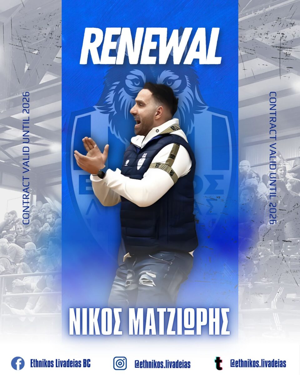 ”Ο Εθνικός Λιβαδειάς βρίσκεται στην ευχάριστη θέση να ανακοινώσει με χαρά την επέκταση της συνεργασίας του με τον Νίκο Ματζιώρη, που φέτος υπηρέτησε την ομάδα μας με πάθος και αφοσίωση ως team manager, μετά την παρουσία του στα παρκέ ως παίκτης.