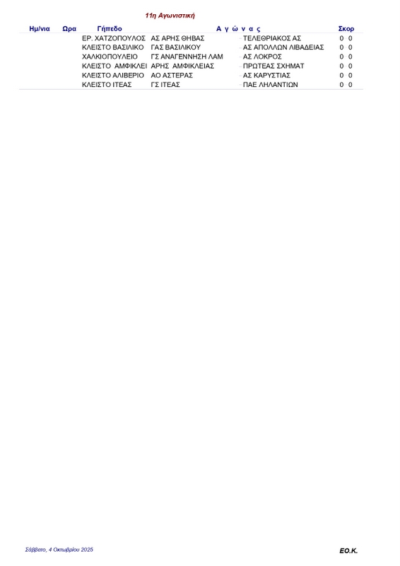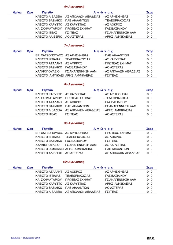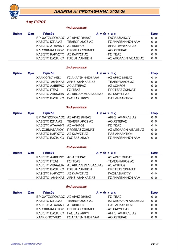 FEATUREDΑ ΕΣΚΑΣΕΚλήρωση Α’ ΕΣΚΑΣΕ 2025-26 pannikolaou4 Οκτωβρίου, 2025458 Share0 Το πρωτάθλημα της Α’ ΕΣΚΑΣΕ για την αγωνιστική περίοδο 2025-26 θα ξεκινήσει στις 18 Οκτωβρίου. Μετά τη σημερινή κλήρωση το πρόγραμμα όλων των αγωνιστικών έχει ως εξής: