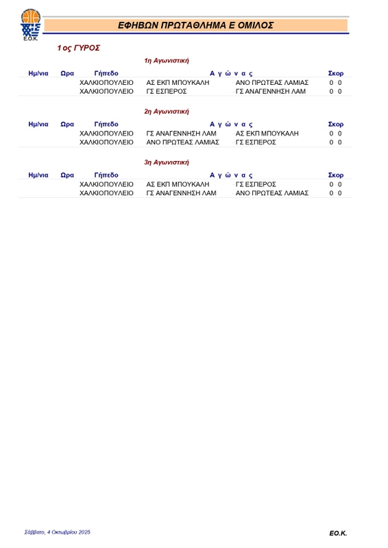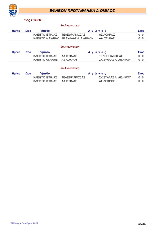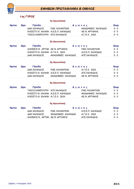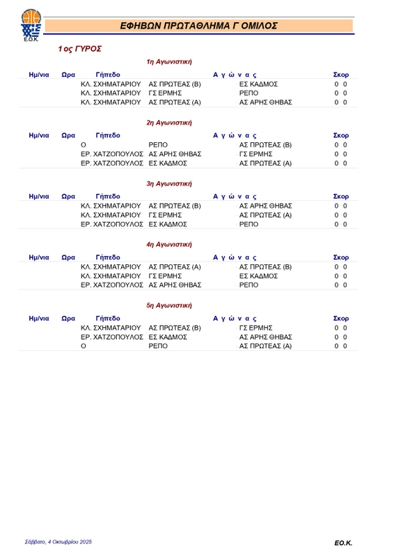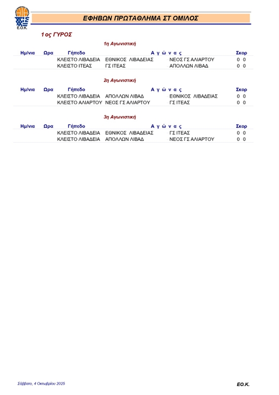 FEATUREDΕΦΗΒΩΝΚλήρωση ΕΦΗΒΩΝ 2025-26 pannikolaou4 Οκτωβρίου, 2025267 Share0 Πραγματοποιήθηκε σήμερα (4/10) στη Θήβα η κλήρωση του πρωταθλήματος εφήβων, που θα κάνει πρεμιέρα την επόμενη Κυριακή 12 Οκτωβρίου. Αναλυτικά το πρόγραμμα των αγώνων: